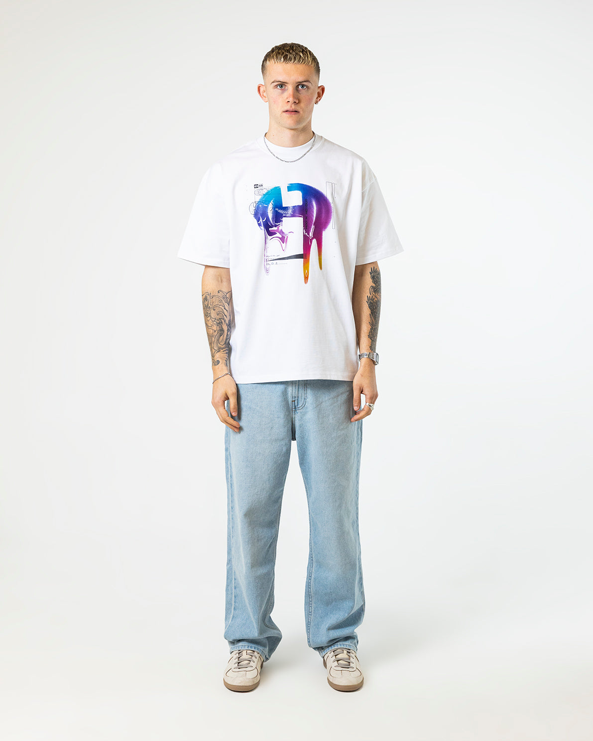 Embrace bold 90s music scene vibes with the Chrome effect White t-shirt. This heavyweight, oversized t-shirt offers an exceptional fit and premium feel for lasting comfort and style. Featuring a striking chrome effect graphic and a central logo with tech sketch branding, it reflects the true Hidden Hideout identity. Perfect for those who want to make a confident statement while enjoying superior quality.