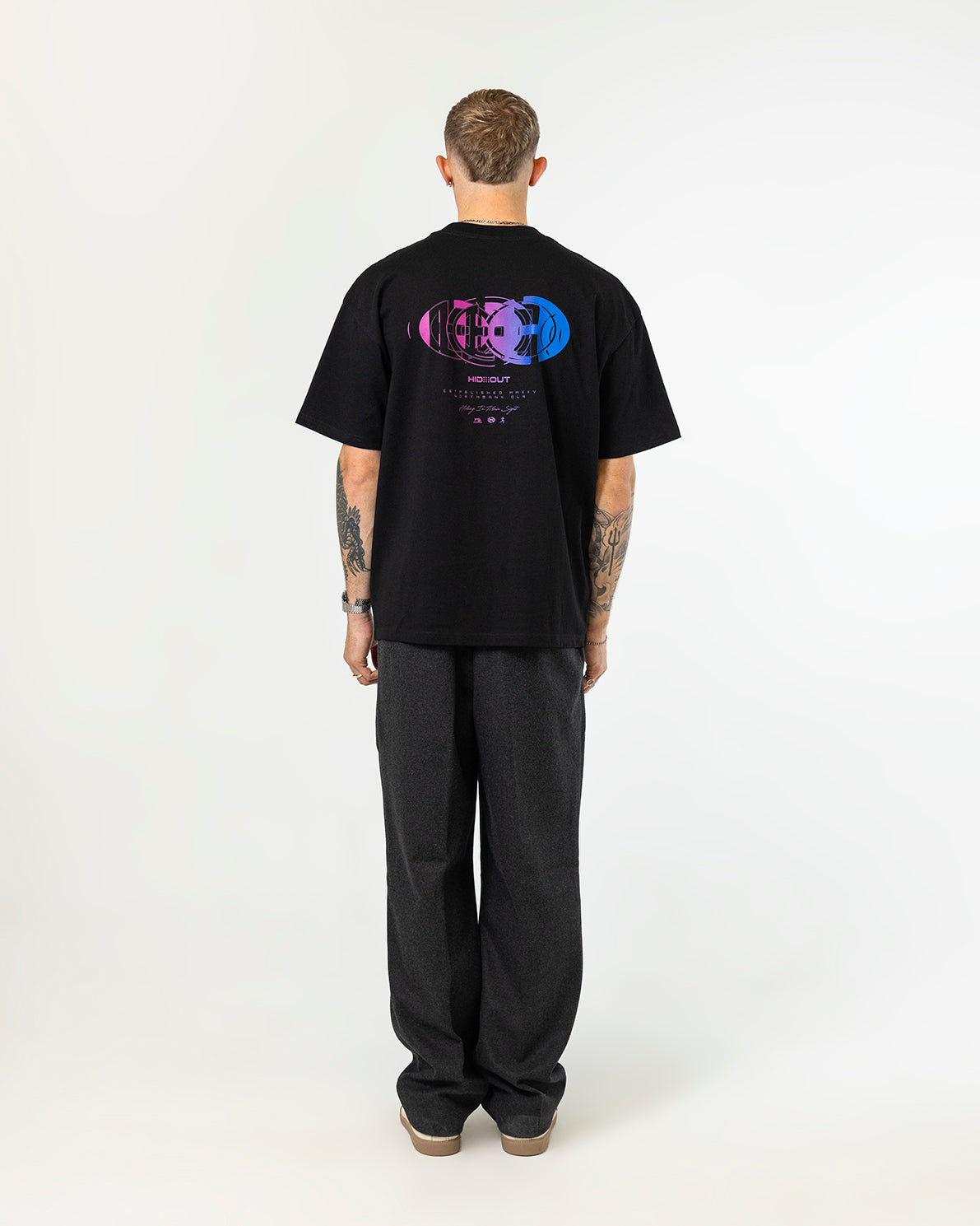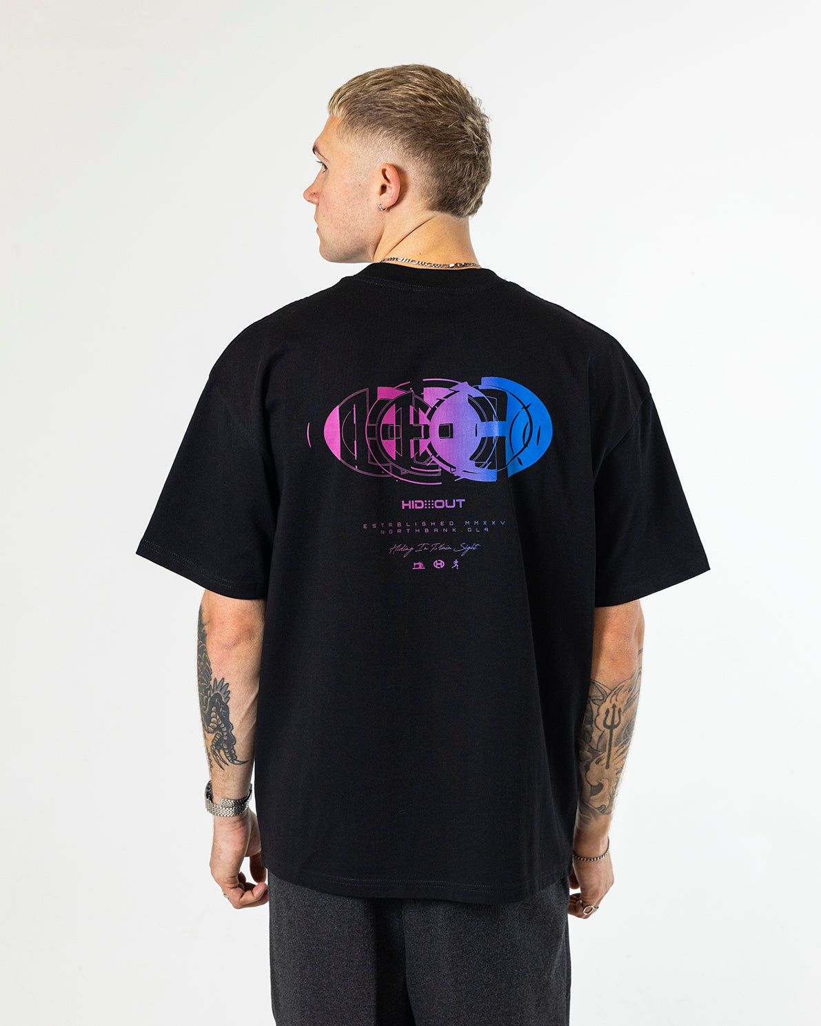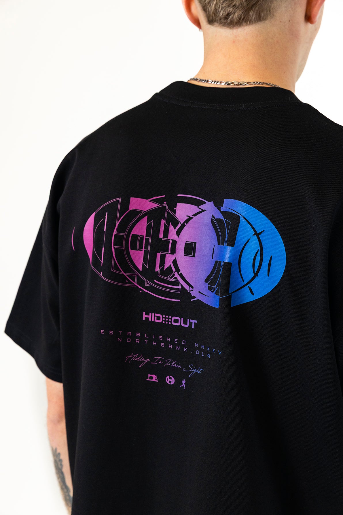 The Shadow Tee in black features a standout etched 3D shadow logo with mirrored pink and blue tones, inspired by vibrant 90s rave colors. Its oversized fit offers comfortable, relaxed wear while making a bold style statement. Perfect for those who want to blend nostalgic flair with modern comfort.