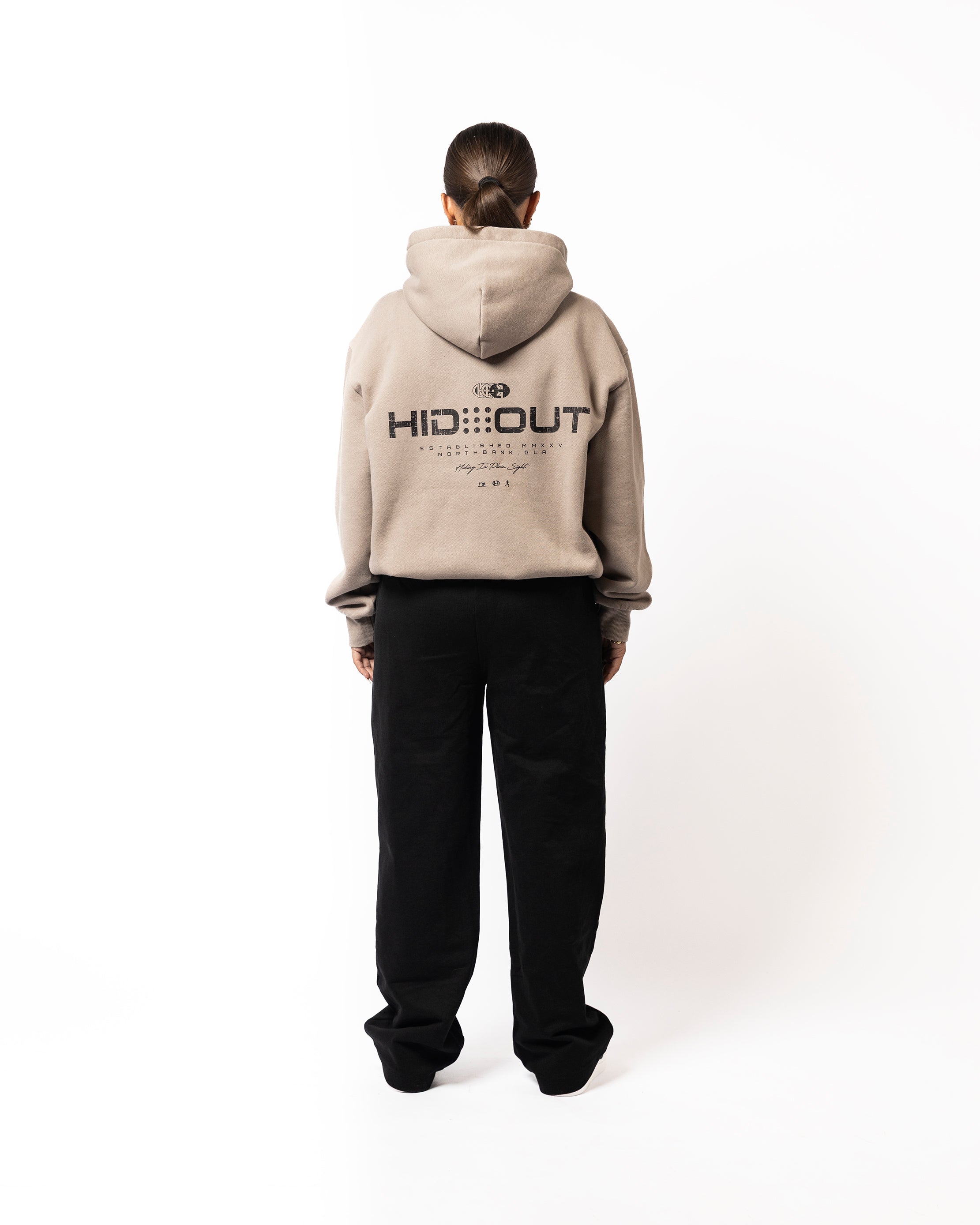 Embrace hoodie season with the Singer Hoody in Greige. This relaxed-fit hoodie features a subtle branded detail on the front and the signature Hideout logo on the back, blending black with shades of Greige for a fresh look for spring. Crafted from 350gsm fabric, it offers warmth and durability, while the distressed print adds character to your seasonal style. Perfect for staying cozy and confident as the weather cools down.