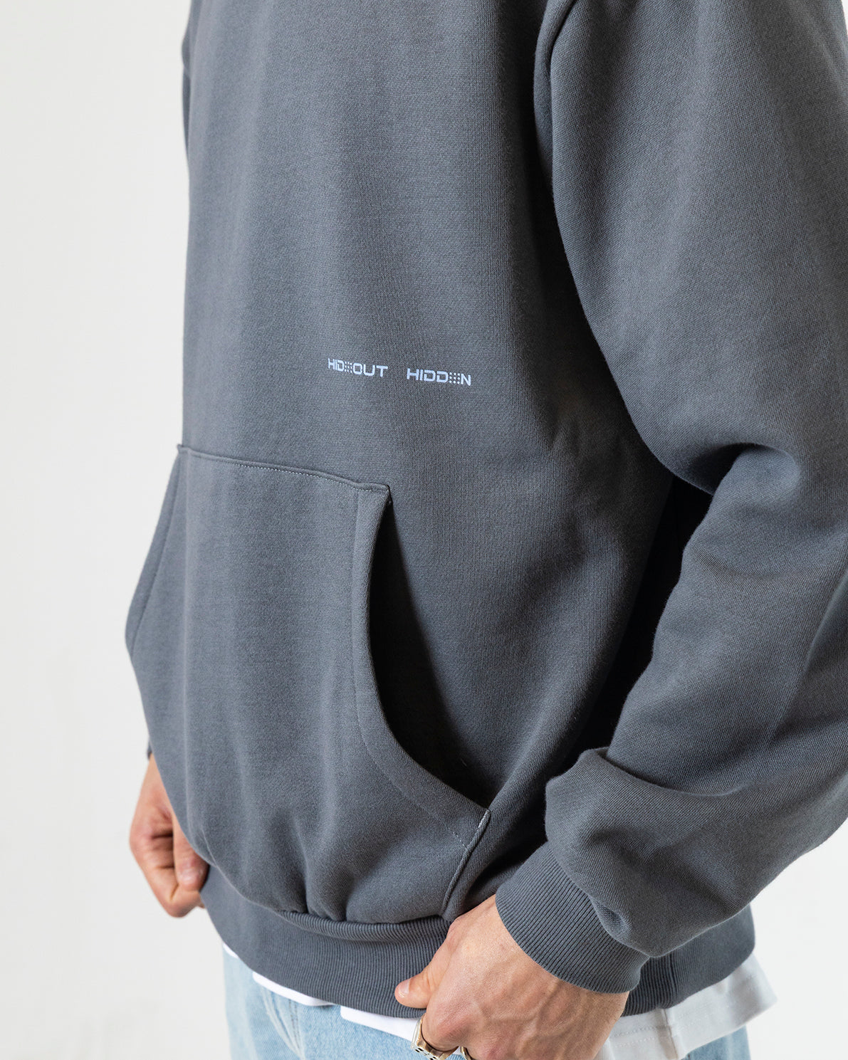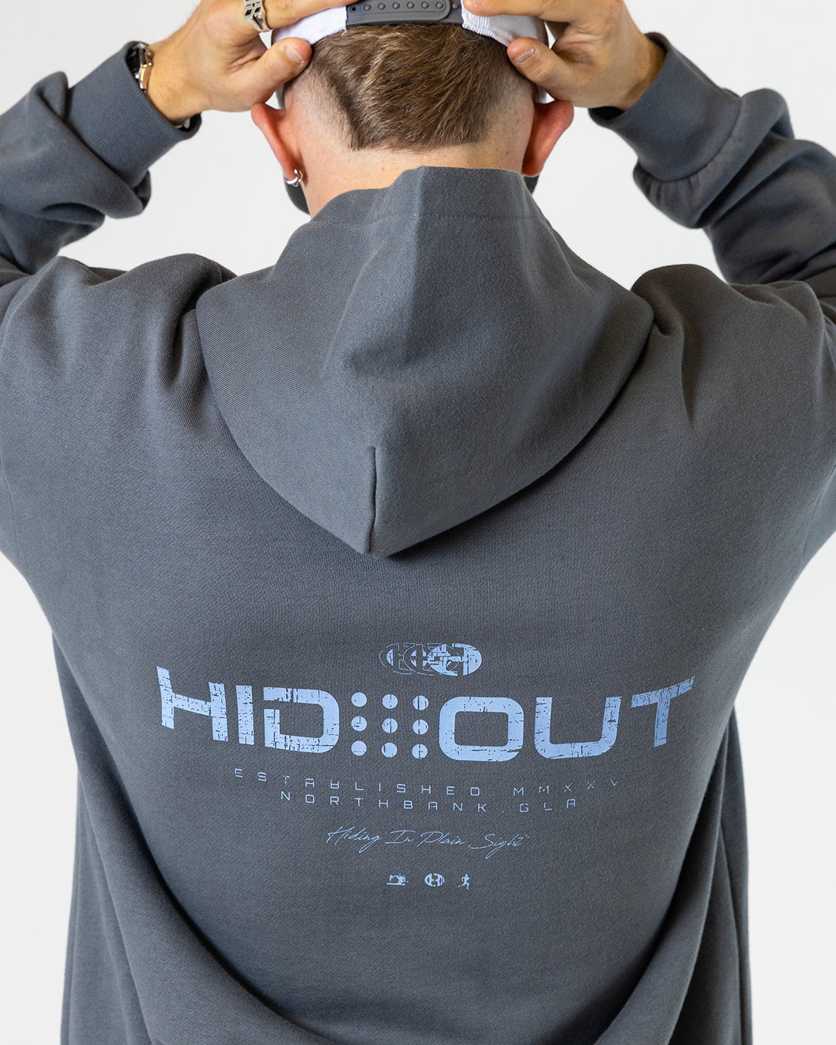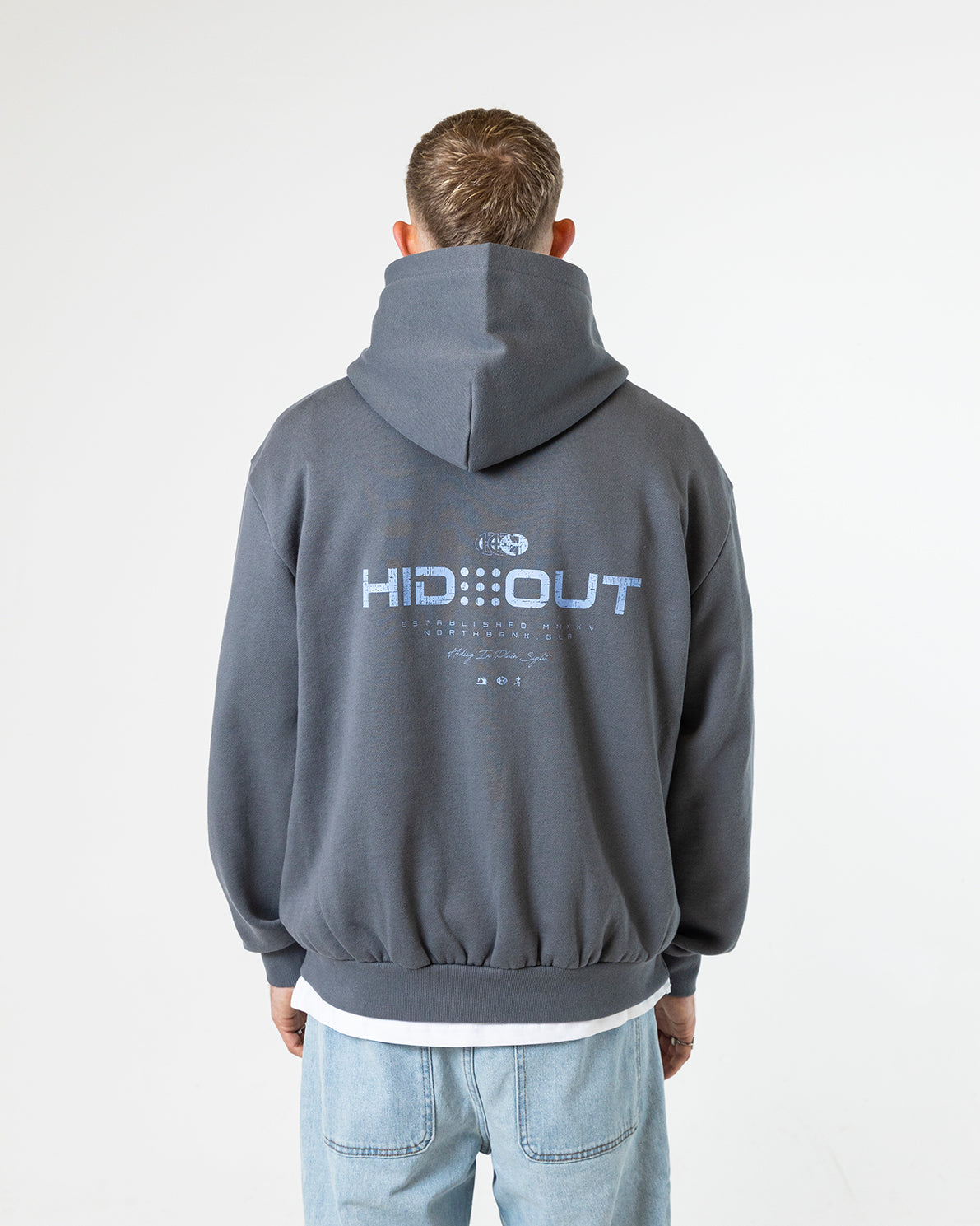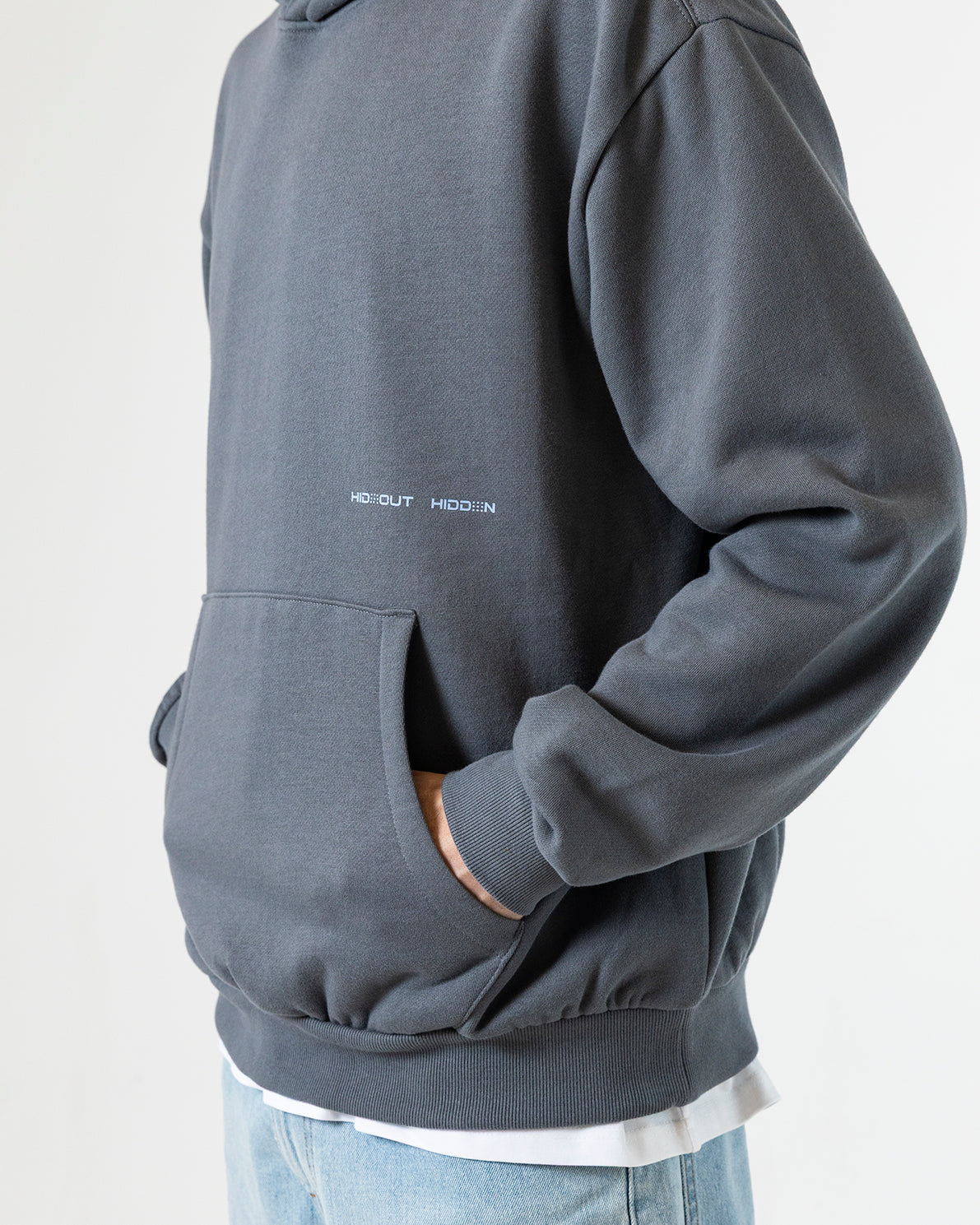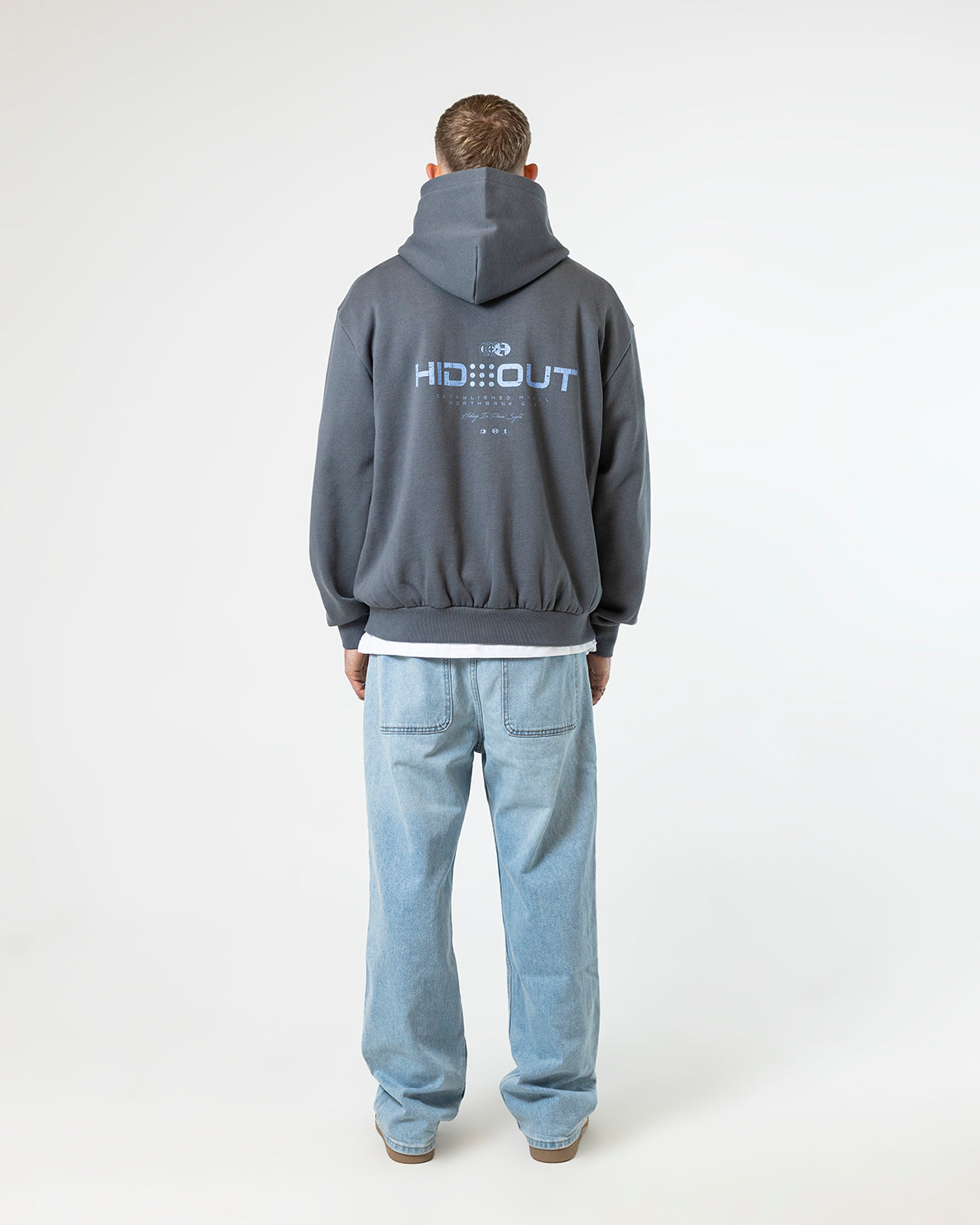 Embrace hoodie season with the Singer Hoody in Shadow/Ice. This relaxed-fit hoodie features a subtle branded detail on the front and the signature Hideout logo on the back, blending ice blue with shadow grey for a fresh autumn-winter look. Crafted from 350gsm fabric, it offers warmth and durability, while the distressed print adds character to your seasonal style. Perfect for staying cozy and confident as the weather cools down.